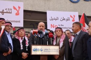 وقال ” اننا هنا من قلب عمان نقول لجلالة الملك الذي يحمل دائما راية الدفاع عن الحق الفلسطيني، الحق في الأرض والمقدسات والدولة المستقلة وعاصمتها مدينة القدس المحتلة”، نحن معك نؤيد وندعم مواقفك الرافضة للتهجير والتوطين.