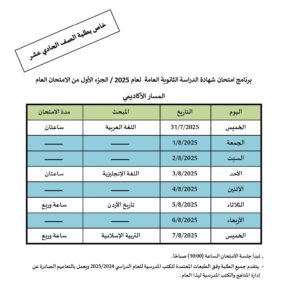اخبار ع النار-أعلنت وزارة التربية والتعليم اليوم عن جدول امتحانات شهادة الدراسة الثانوية العامة لعام 2025 لطلبة الصف الحادي عشر.