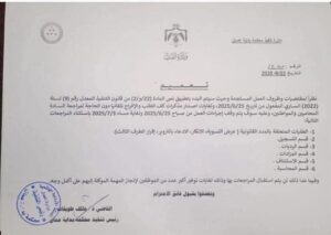 اخبار ع النار-أعلنت دائرة تنفيذ محكمة بداية عمان، وقف إجراءات العمل من صباح 2025/6/25 ولغاية مساء 2025/7/3، وذلك للبدء بتطبيق نص المادة (22) / و(2) من قانون التنفيذ المعدل رقم (9) لسنة (2022) الساري المفعول من تاريخ 2025/6/25، والمتعلق بوقف حبس المدين.