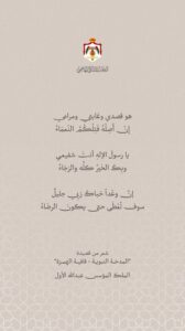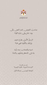 وانشدت أبيات الشعر من قصيدة “المدحة النبوية – قافية الهمزة” التي نسجها الملك المؤسس في مدح جده الأعظم النبي خلال الفعالية الدينية التي أقيمت في قصر الحسينية أمس بحضور جلالة الملك عبدالله الثاني وولي العهد الأمير الحسين بن عبدالله