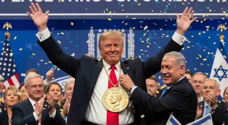 اخبار ع النار-في خطوة رمزية ذات دلالات سياسية عميقة، نشر رئيس وزراء الاحتلال الإسرائيلي بنيامين نتنياهو صورة مُولّدة بالذكاء الاصطناعي للرئيس الأمريكي دونالد ترمب وهو يرتدي ميدالية جائزة نوبل للسلام.