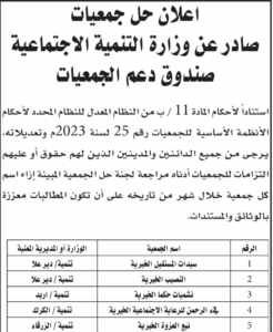 اخبار ع النار-دعت وزارة التنمية الاجتماعية/صندوق دعم الجمعيات، جميع الدائنين والمدينين للجمعيات المعلن عن حلها أدناه، ممن لهم حقوق أو عليهم التزامات مالية، إلى مراجعة لجان حل وتصفية الجمعيات المُبينة إزاء اسم كل جمعية لاتخاذ الإجراءات اللازمة.