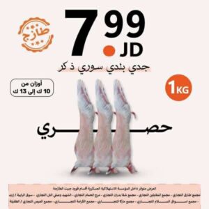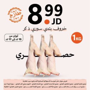 وفق العرض المدرج ادناه يباع كلغم الجدي السوري ب ٨ دنانير والخروف من ذات المصدر ب ٩ دنانير.