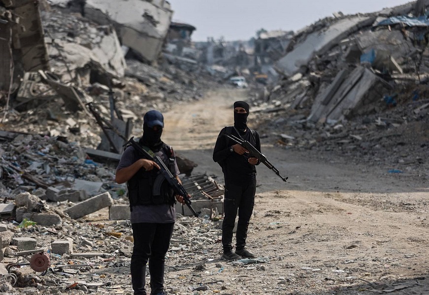 Hamas militants guard an area where they are searching for the bodies of hostages with the help of the International Committee of the Red Cross (ICRC) in Gaza City on November 3, 2025. The October 10 ceasefire in the two-year-long Israel-Hamas war, brokered by US President Donald Trump, has been sorely tested by continued Israeli strikes and claims of Palestinian attacks on Israeli soldiers. Since the start of the truce, Hamas has released the 20 surviving hostages and begun handing over the remains of 28 deceased captives. (Photo by Omar AL-QATTAA / AFP)