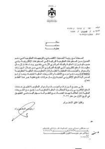ووجه حسان كتابا الى الوزارات والدوائر الرسمية والمؤسسات والهيئات الحكومية والبلديات وامانة عمان، أكد فيه على الانسجام مع رؤية التحديث الاقتصادي والتوجيهات الحكومية في دعم التحول من المدفوعات الحكومية الورقية الى المدفوعات الالكترونية وفي ضوء قيام وزارة المالية والبنك المركزي الاردني بتطوير وبناء نظام لارسال معلومات الدفع الالكتروني الى البنك المركزي من خلال الوزارات والدوائر والمؤسسات المطبقة لنظام إدارة المعلومات المالية الحكومية(GFMIS) وبما يتواءم مع الانظمة والتشريعات المالية المتبعة.